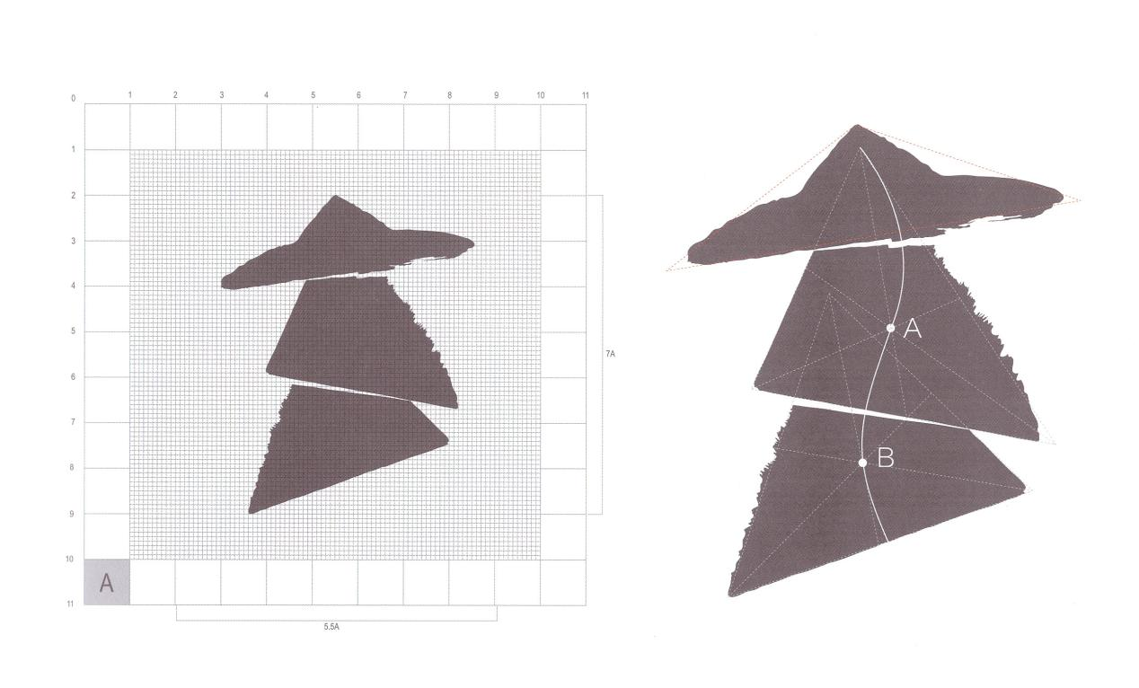 2.以三角形每条边中心点连接对角的方式找出图形的“重心”A和B。